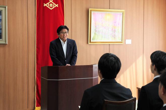 新規採用職員辞令交付式で職員を激励する市長