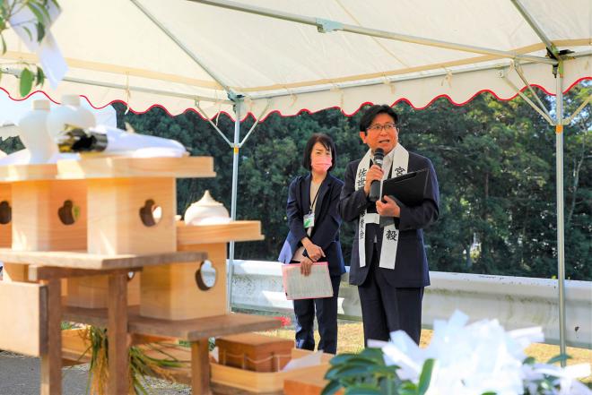 佐世保市宮中献穀事業「抜穂祭」であいさつする市長