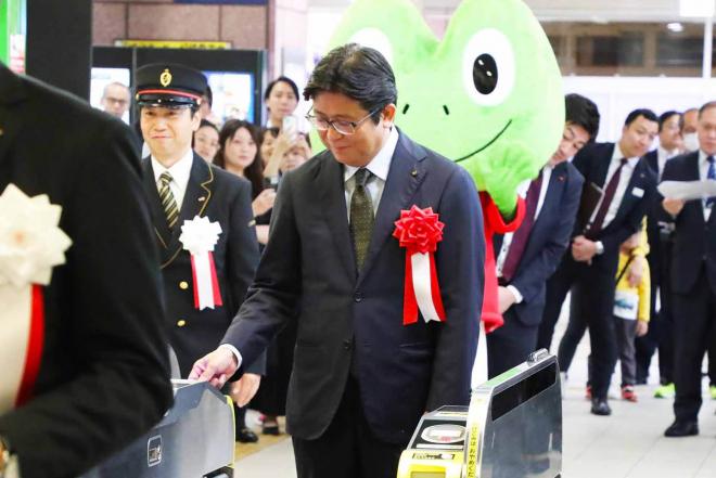 ICカード「SUGOCA」エリア拡大の記念セレモニーで渡り初めをする市長