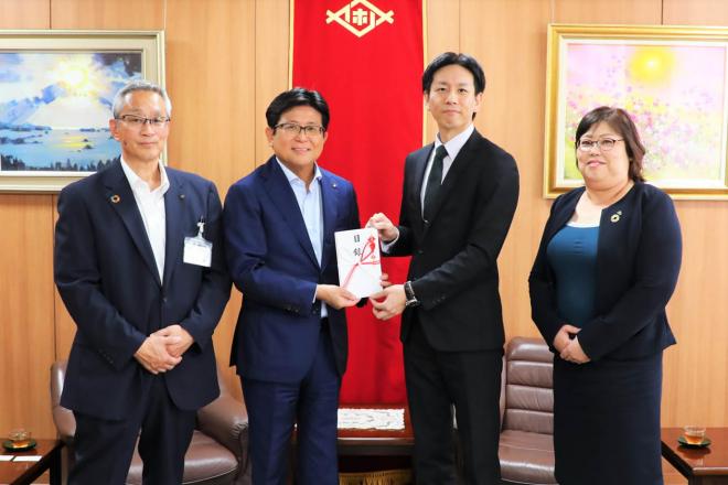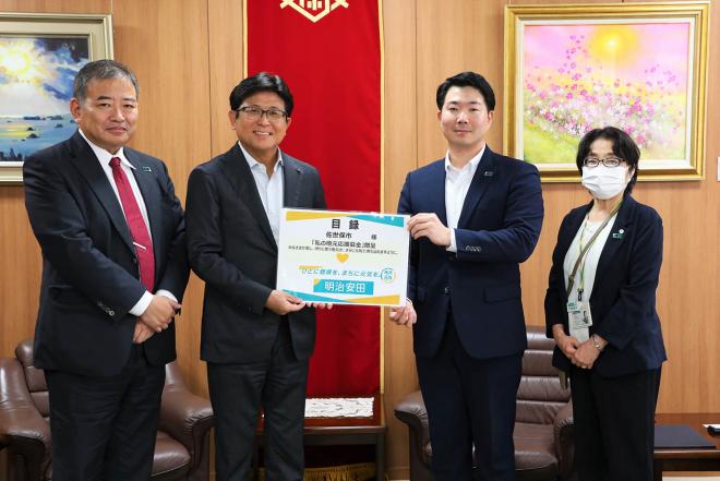 子ども未来基金へ寄付金の贈呈のため市役所を訪れた明治安田生命保険相互会社の皆さんと市長