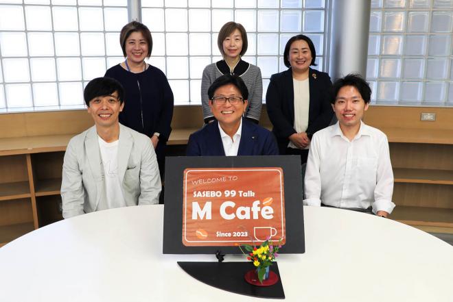 車座集会「SASEBO 99 Talk M Café」で参加者と記念撮影をする市長