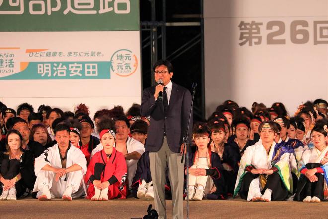 第26回YOSAKOIさせぼ祭りであいさつする市長