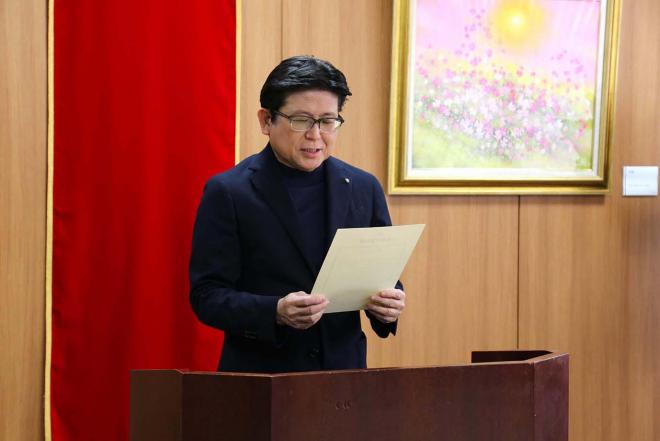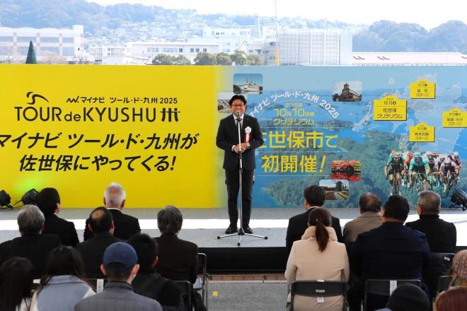マイナビ・ツール・ド・九州の開催にあたり行われたクリテリウム関連のイベントであいさつをする市長