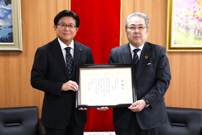 企業版ふるさと納税の寄付を行うため市役所を訪れた株式会社Kyuホールディングスの廣島代表取締役社長兼CEOと市長