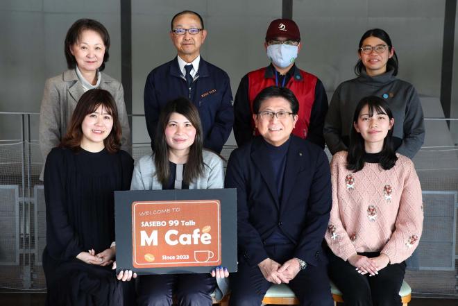 車座集会「SASEBO 99 Talk M Café」で参加者と記念撮影をする市長