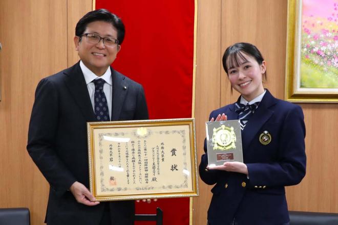 第71回国際理解・国際協力のための高校生の主張コンクールで外務大臣賞を受賞した報告に市役所を訪れた九州文化学園高等学校のブラッドリー美碧スカイさんと市長