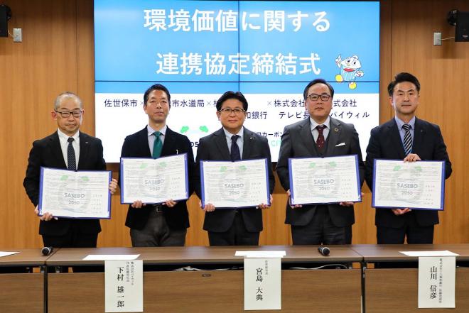 環境価値に関する連携協定締結式のため市役所を訪れた株式会社十八親和銀行、株式会社テレビ長崎、株式会社バイウィル、佐世保市水道局の代表と市長