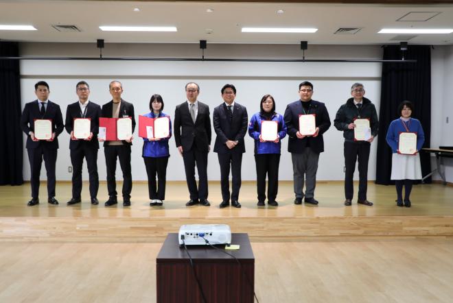 S-1グランプリ☆MORE!のGPステージ「自分が変えるプロジェクト★させぼ自変」の表彰者と記念撮影する市長