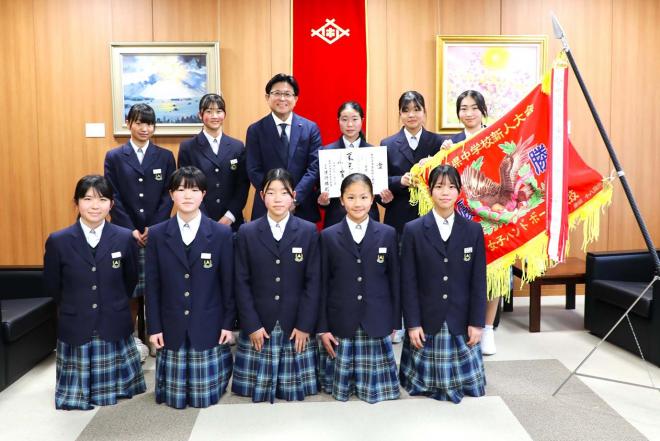 春の全国大会出場の報告に市役所を訪れた相浦中学校女子ハンドボール部の皆さんと市長