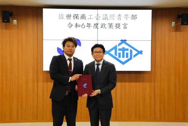 政策提言書を提出するため市役所を訪れた佐世保商工会議所青年部の代表と市長