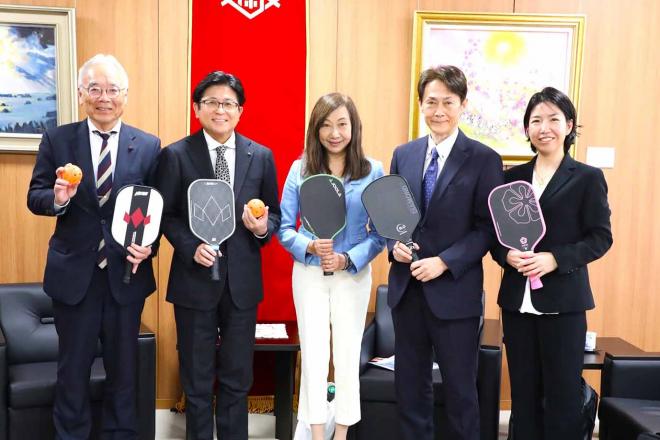 PJFピックルボールジャパンオープン佐世保in長崎(国際大会)の開催報告のため市役所を訪れた一般財団法人ピックルボール日本連盟の林理事と市長