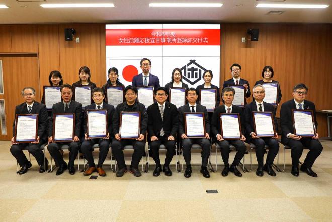 佐世保市女性活躍応援宣言事業所登録証の交付式で本年度新たに登録いただいた関係企業・団体の皆さんと市長