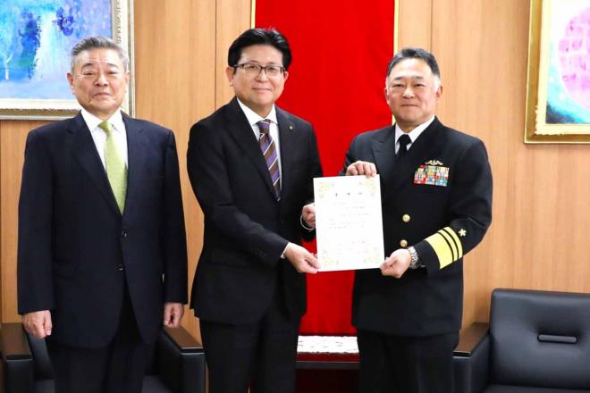 日本遺産・佐世保鎮守府名誉長官に選任された海上自衛隊佐世保地方総監の俵千城総監と市長