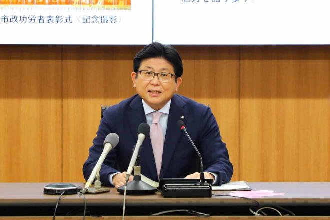 定例記者会見で記者からの質問に答える市長