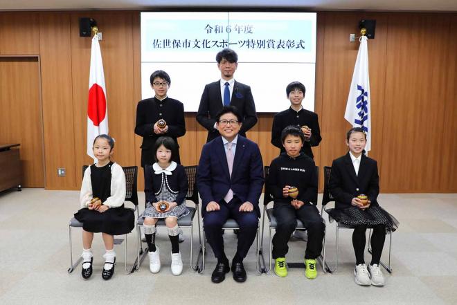 佐世保市文化スポーツ特別賞表彰のため市役所を訪れた皆さんと記念撮影をする市長