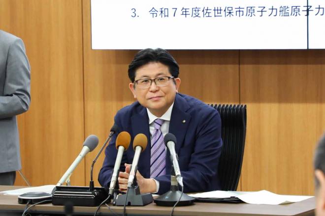 定例記者会見で記者からの質問に答える市長