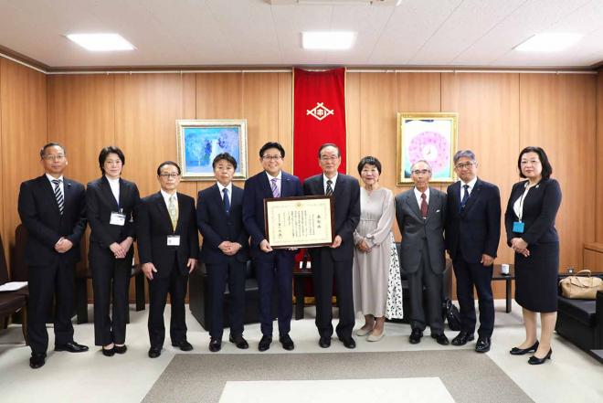 令和6年度コミュニティ・スクールおよび地域学校協働活動に係る文部科学大臣表彰受賞の報告のため市役所を訪れた海光る町学園運営協議会の皆さんと市長