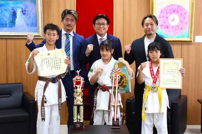 極真空手の世界大会出場報告のため市役所を訪れた選手の皆さんと市長