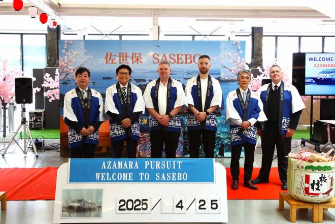 クルーズ客船「アザマラパシュート」の初寄港セレモニーに出席する市長