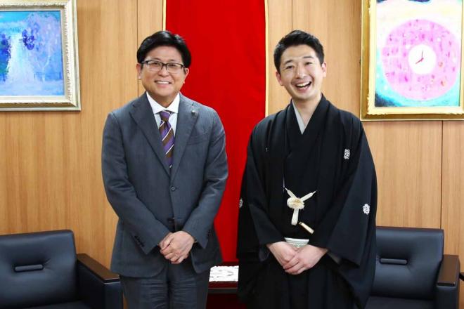 落語GWツアー「三遊亭らっ好独演会」の開催報告に市役所を訪れた三遊亭らっ好さんと市長