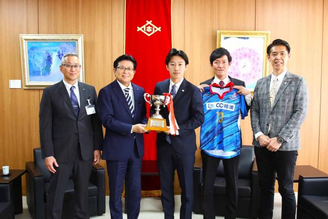 九州フットサルリーグ1部優勝および地域チャンピオンズリーグ出場の報告に市役所を訪れたエスタジ佐世保フットサルクラブの皆さんと市長