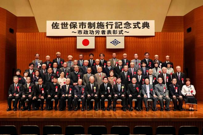 市制施行記念式典で市政功労表彰者と記念撮影をする市長