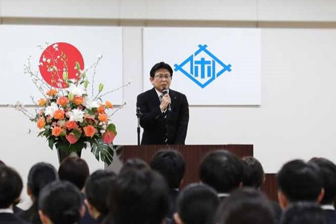 新規採用職員辞令交付式で激励の言葉を述べる市長