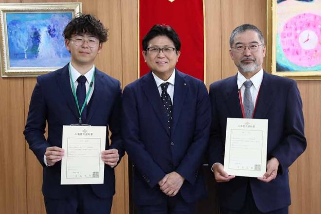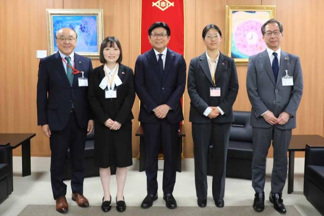 令和7年度国際交流員に任用された中国国際交流員の李琪さん(写真左)と韓国国際交流員の雀守延さん(写真右)と市長