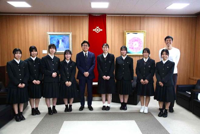 全国高校生マイプロジェクトアワード2024全国summitに出場した報告のため市役所を訪れた市内高校横断型サークル「Sasebo change」の皆さんと市長