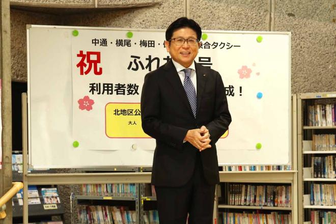 乗合タクシーふれあい号の利用者が40万人達成したことのお礼の言葉を述べる市長