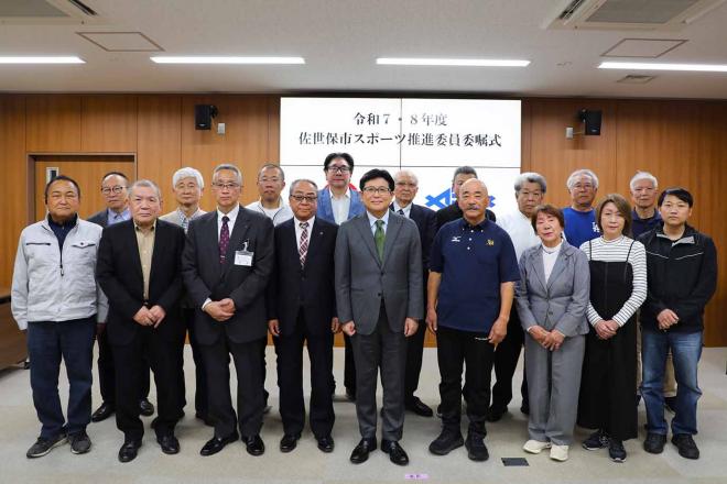 令和7、8年度の佐世保市スポーツ推進委員委嘱式のため市役所を訪れた関係者の皆さんと市長