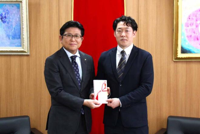 寄付金の贈呈のため市役所を訪れた一般社団法人日本競輪選手会長崎支部の佐藤支部長と市長
