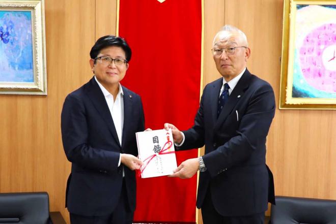 寄付金の贈呈のため市役所を訪れた佐世保港湾運輸株式会社の村上代表取締役社長と市長