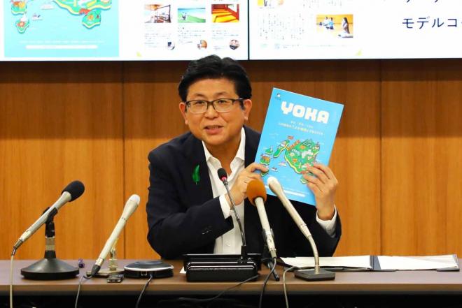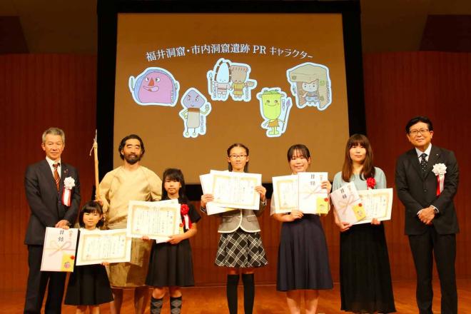 福井洞窟特別史跡指定記念式典で福井洞窟PRキャラクター(ゆるキャラ)の採用者たちと記念撮影する市長
