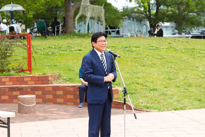 佐世保港へ3隻のクルーズ客船同時入港に合わせて開催された、させぼ岸壁酒場~春の陣~であいさつする市長