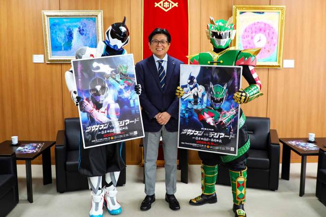第2回さかな市「サカナマンVSデジマード~一振りの妖刀~」の長崎講演の開催報告のため市役所を訪れたサカナマン(写真左)とデジマード(写真右)と市長