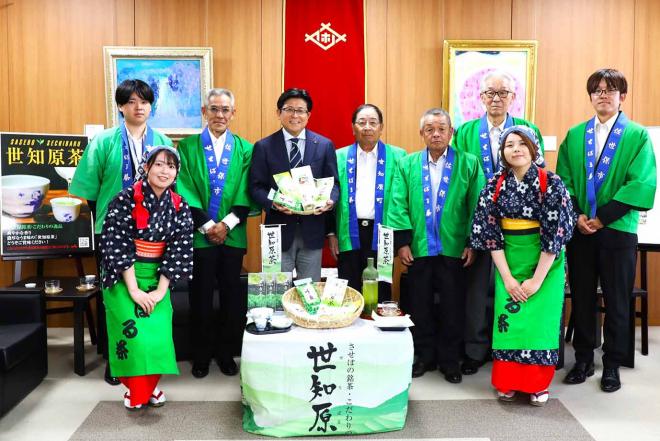 世知原茶の消費拡大とじげもん市の開催報告のため市役所を訪れた世知原茶振興会の皆さんと市長