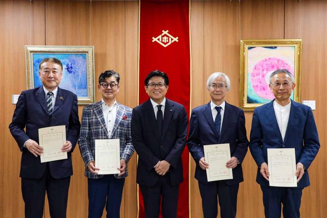 令和7年度企業立地推進アドバイザーに委嘱状を交付し、記念撮影をする市長