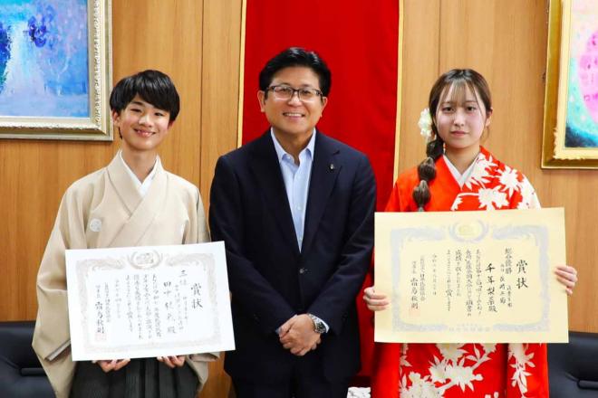 民謡の全国大会の出場報告のため市役所を訪れた田中統我さん(写真左)と千年梨菜さん(写真右)と市長