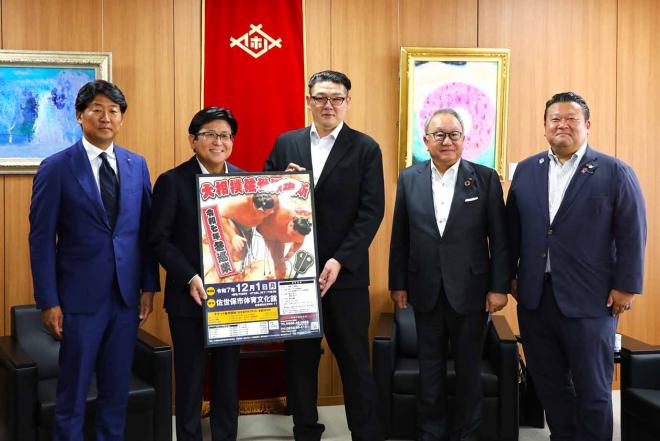 令和7年冬巡業佐世保場所の開催報告のため市役所を訪れた大相撲佐世保場所実行委員会の皆さんと市長