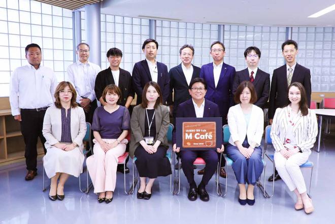 車座集会「SASEBO 99 Talk M Café」で参加者と記念撮影をする市長