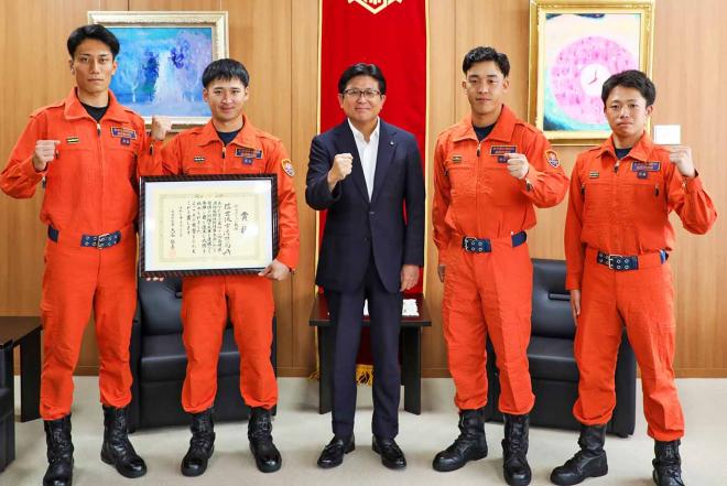「第53回九州地区消防救助技術指導会」への出場報告のため市役所を訪れた消防局の皆さんと市長