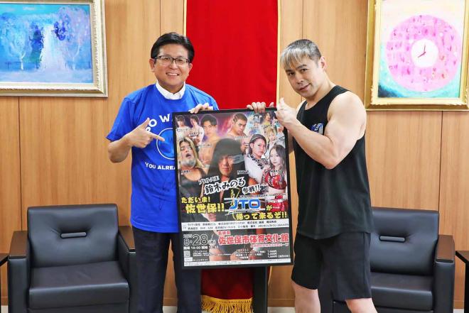 佐世保市で大会が開催されることのあいさつに市役所を訪れたプロレス団体「JTO」のTAKAみちのく代表と市長