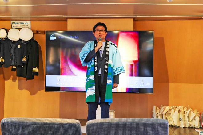 西海国立公園指定70周年記念「西海ごちそうフェスタ〜九十九島ひらまさの陣〜美食クルーズパールクィーンサンセットクルーズ」でパールクィーンに乗船し、あいさつする市長