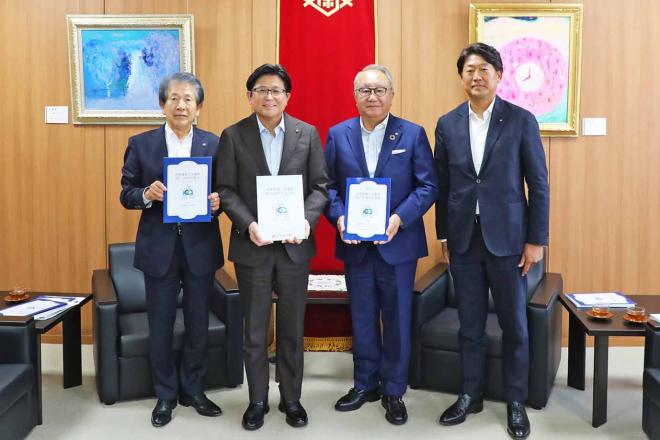 佐世保商工会議所創立100周年記念誌の贈呈と提言書提出のため市役所を訪れた佐世保商工会議所の皆さんと市長
