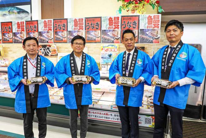 西海国立公園指定70周年を記念して、株式会社エレナ×サントリー株式会社の共同企画「長崎の海を守るお買い物キャンペーン」のお披露目会に出席する市長