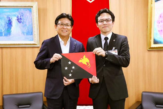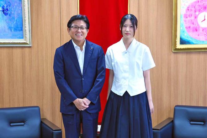 JICA海外協力隊派遣に参加する報告のため市役所を訪れたJICA海外協力隊の岡田さんと市長