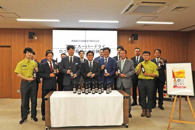 西海国立公園指定70周年記念「アサヒスーパードライロゴ入り瓶ビール」のお披露目会のため市役所を訪れた関係者の皆さんと市長