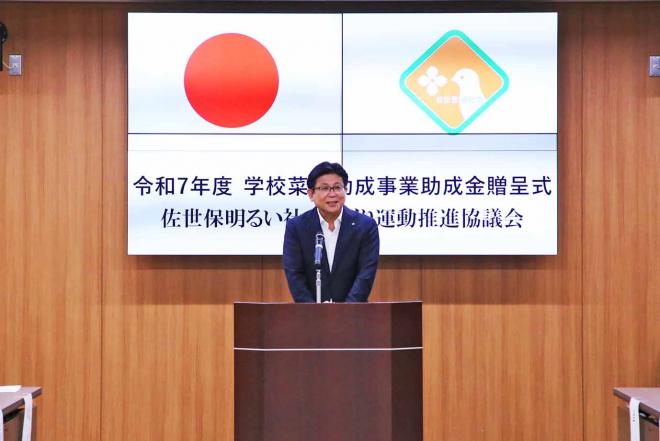 令和7年度学校菜園助成事業助成金の贈呈式であいさつをする市長