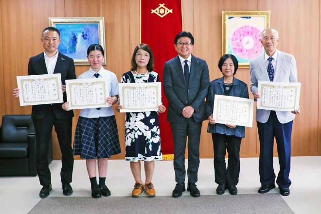 「長崎県高等学校将棋選手権大会」女子個人の部で優勝し、「全国高等学校総合文化祭(将棋部門)」への出場報告のため市役所を訪れた川棚高等学校3年の岡部歩寧さんと市長